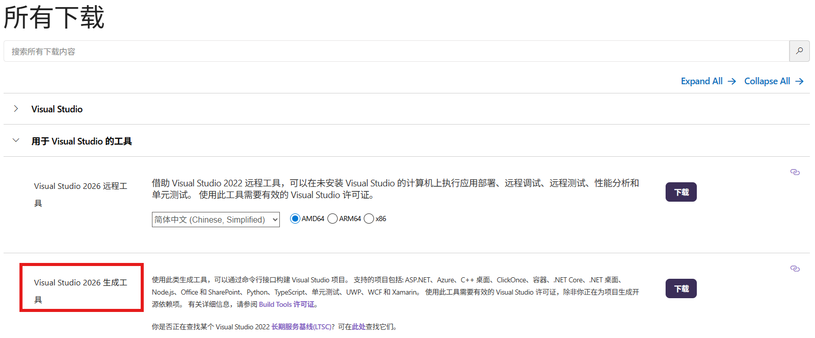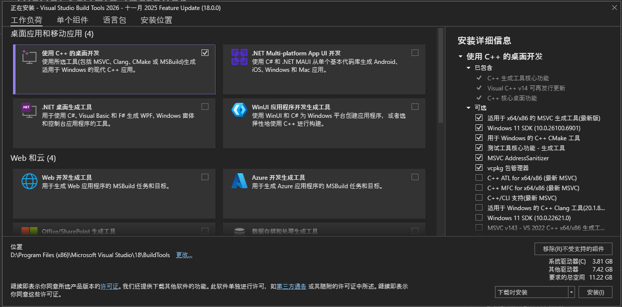在 Windows 下编译 C++ 代码时,下载 Visual Studio 太庞大臃肿了,微软提供了只下载 Visual Studio 2026 生成工具 (页面滑倒最下方)的方式。