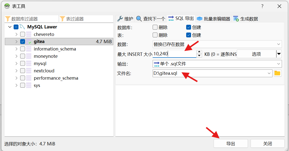 为了确保所有数据都能完成导出,建议将 最大 INSERT 大小 的值尽可能加大。